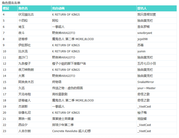 提名角色里有5个出自咱K,分别是【伏见猿比古】【伊佐那社】【比水流】【夜刀神狗朗】【宗像礼司】