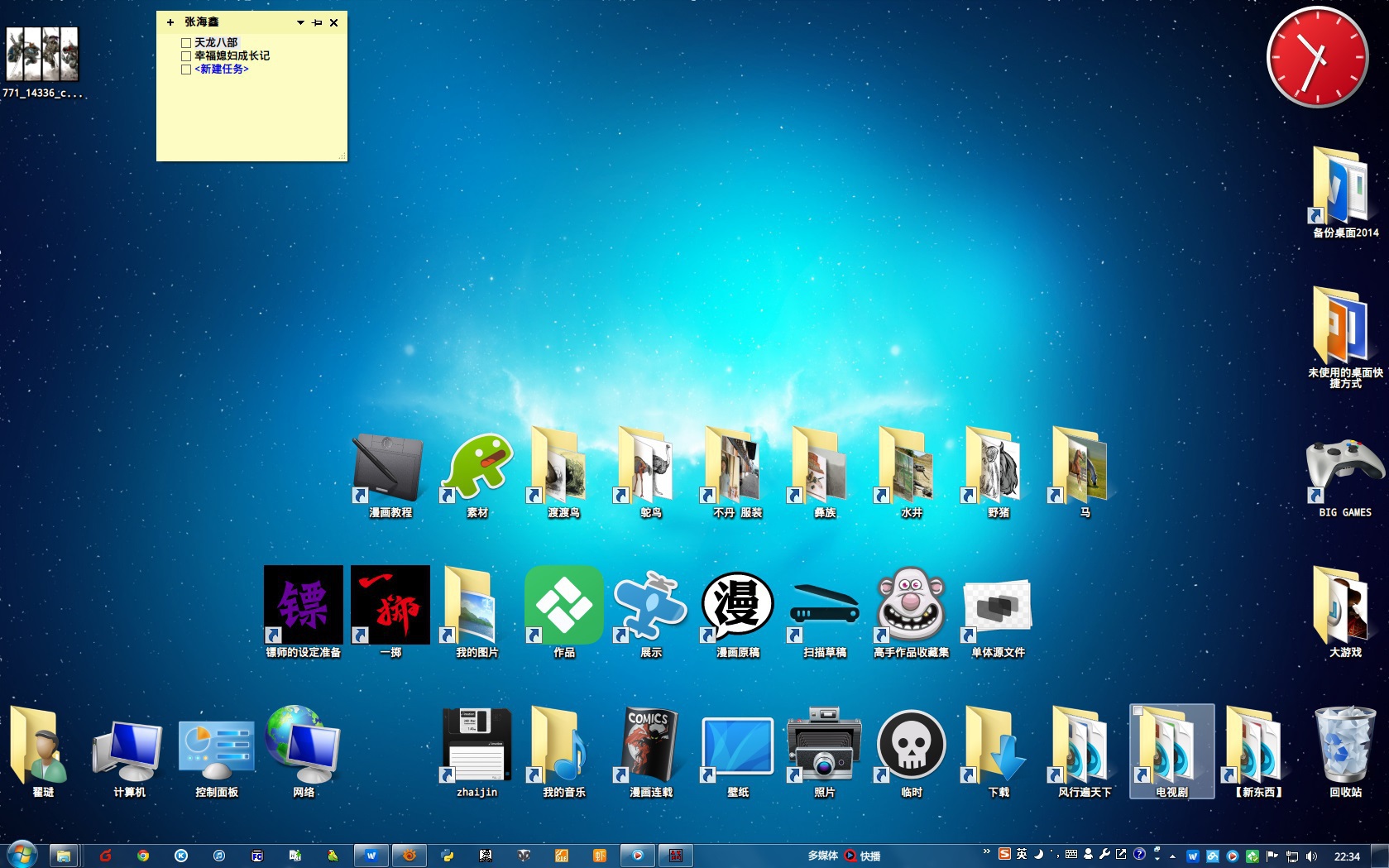 用了半个月时间整理了下文件夹的结构和命名,并且为常用的文件夹下载或者画了新图标,使得在Win7下方便查找,我的软件全部钉在开始菜单或者下面的快速启动栏了,这样桌面可以直达最近正在创作的作品的目录!