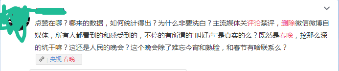 我想到了《乌合之众》这本书额,群体的智慧有时不如精英的智慧。他们被狂热绑架了,当周围的人发表了倾向性观点时,很容易被这种倾向干扰选择。我没有去吐槽春晚,这个时候应该保持冷静,理智分析。当民众被狂热所控制,观点被一些人挟持,是很难做出明智的选择的,例如纳粹(¯Д¯)ノ。春晚的评论不是不给言论自由,而是根