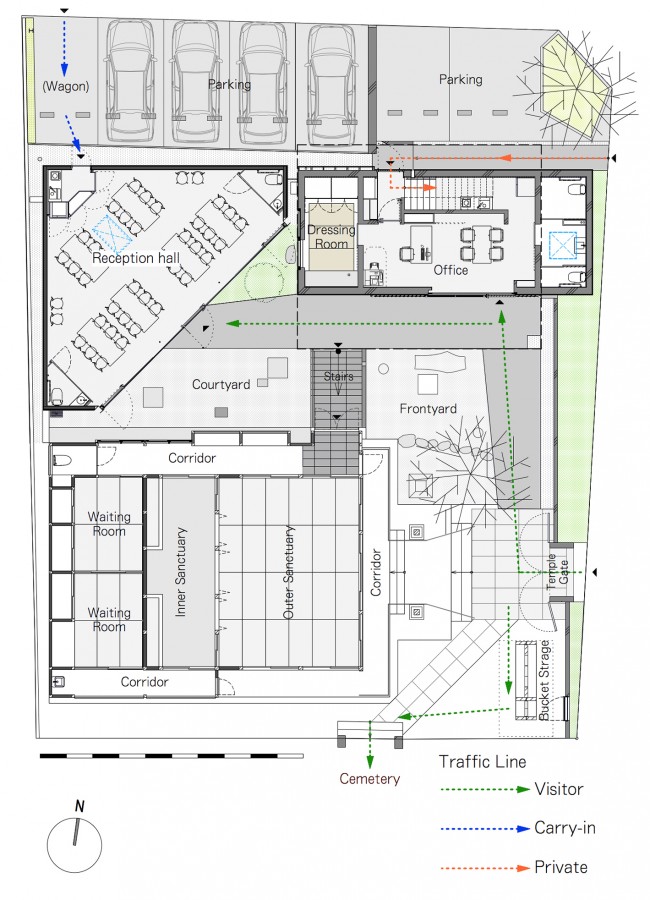 基地位于街区的东北角,基地的北侧面对着学校操场和孩子们的公园。由于不恰当的扩建和绿化,这一区域的通风极其不好,且对于一座宗教场所来说,此地过于脏乱了些。庙宇的主殿在二战空袭中被摧毁,战后新的主殿在旧址上伫立起来,成为和平时代的象征,但由于当时物资匮乏,重